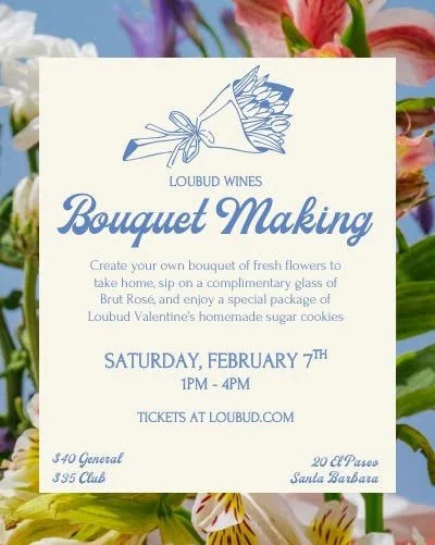 Ticket includes a glass of Brut Rosé, a bag of Loubud sugar cookies and a fun afternoon building a bouquet with friends.